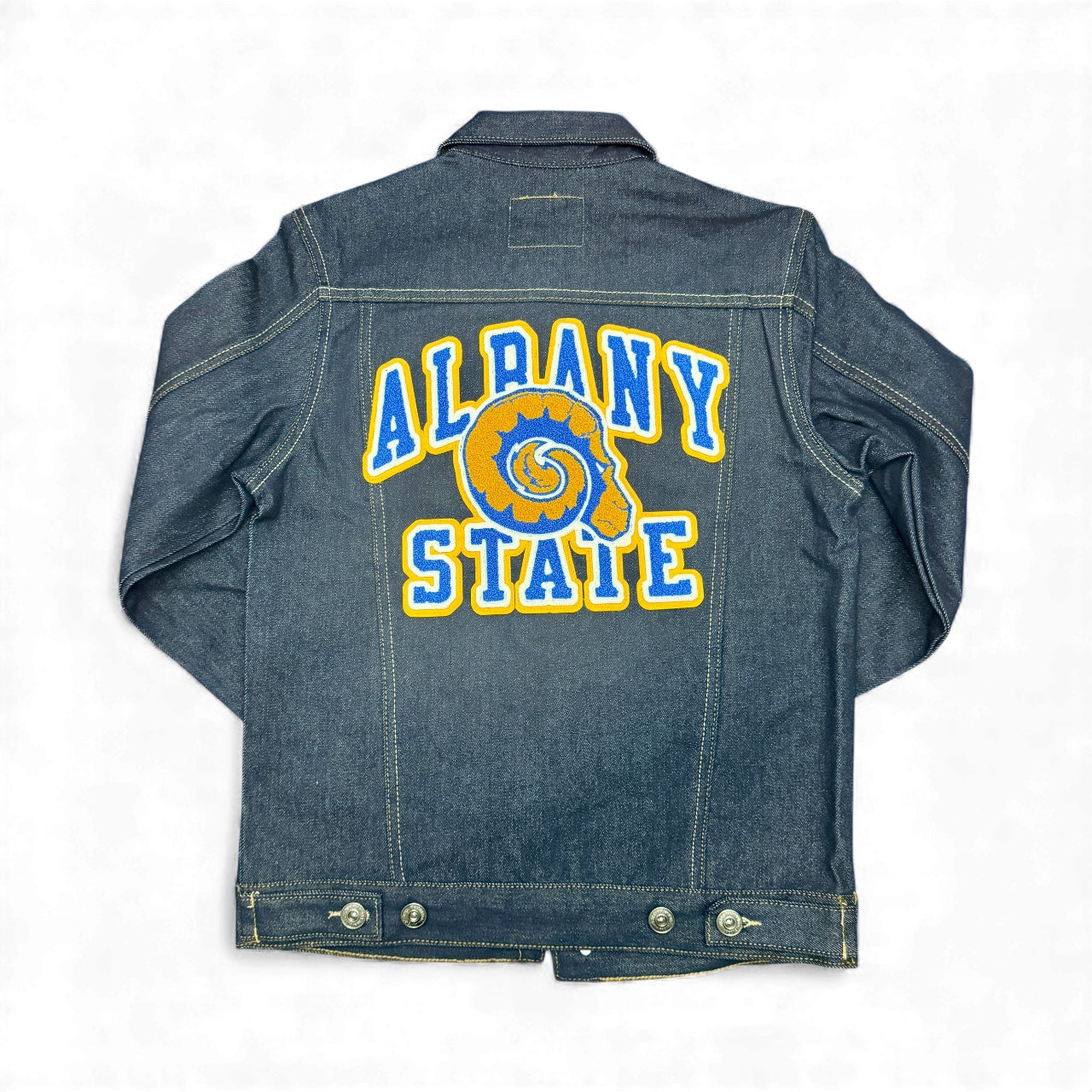 Premium Dark Blue Denim Jacket with the Royal/Gold/White chenille embroidery! Represent your HBCU in style with this premium Denim Jacket!