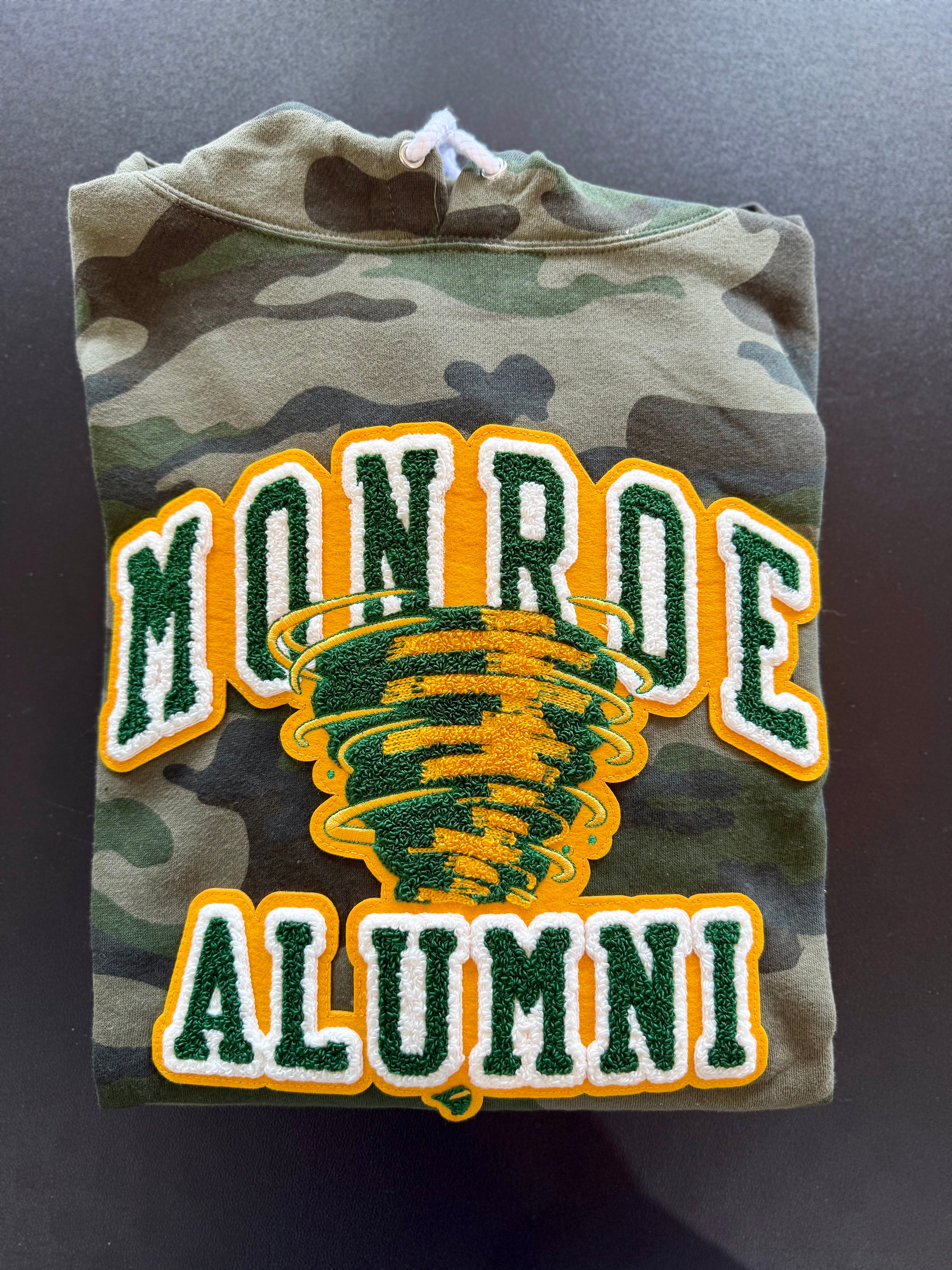 Premium Camo Fleece Hoodie with Monroe Alumni Chenille Embroidered Logo.