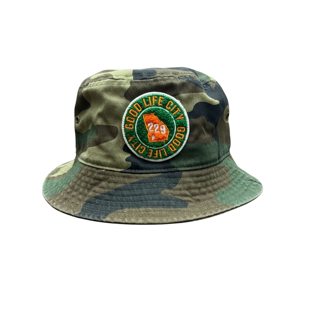 Premium Camo Bucket Hat with Green/Orange//White Embroidered Good Life 229 Logo
